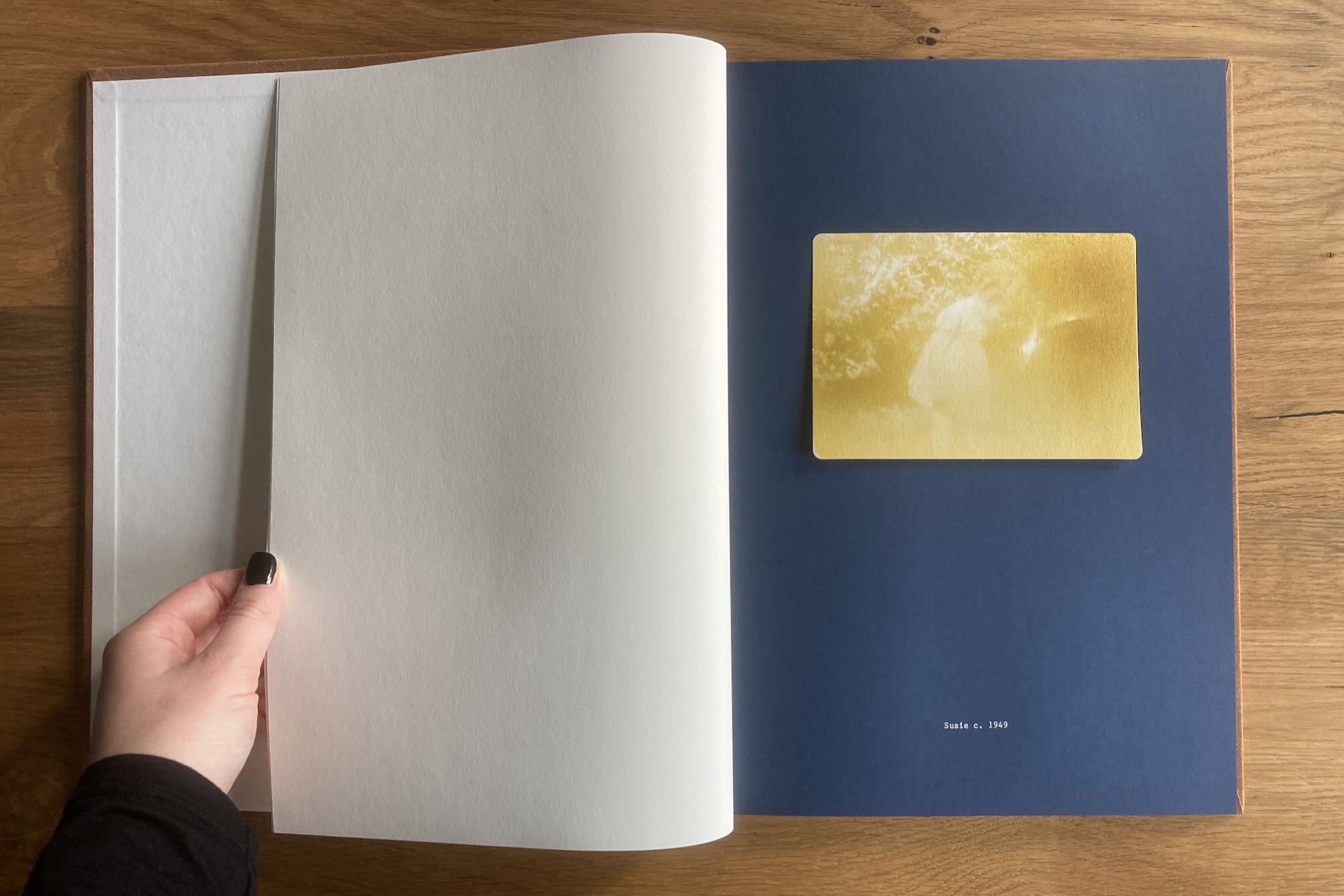 Each of the 27 images (including the cover photo of his mother) recalls the meticulous nature of a scrapbook or a 19th-century scientific catalog. Or simply what it is, a family photo album. The process itself becomes ritualistic: burning images into existence with the same chemicals that was once an essential in his mothers life. Rather than fading, these photographs emerge – rising from the ashes, demanding remembrance. Each book is hand-numbered and uniquely marked-singed with a lit cigarette, a final gesture that turns each edition into a singular tribute to impermanence and grief.