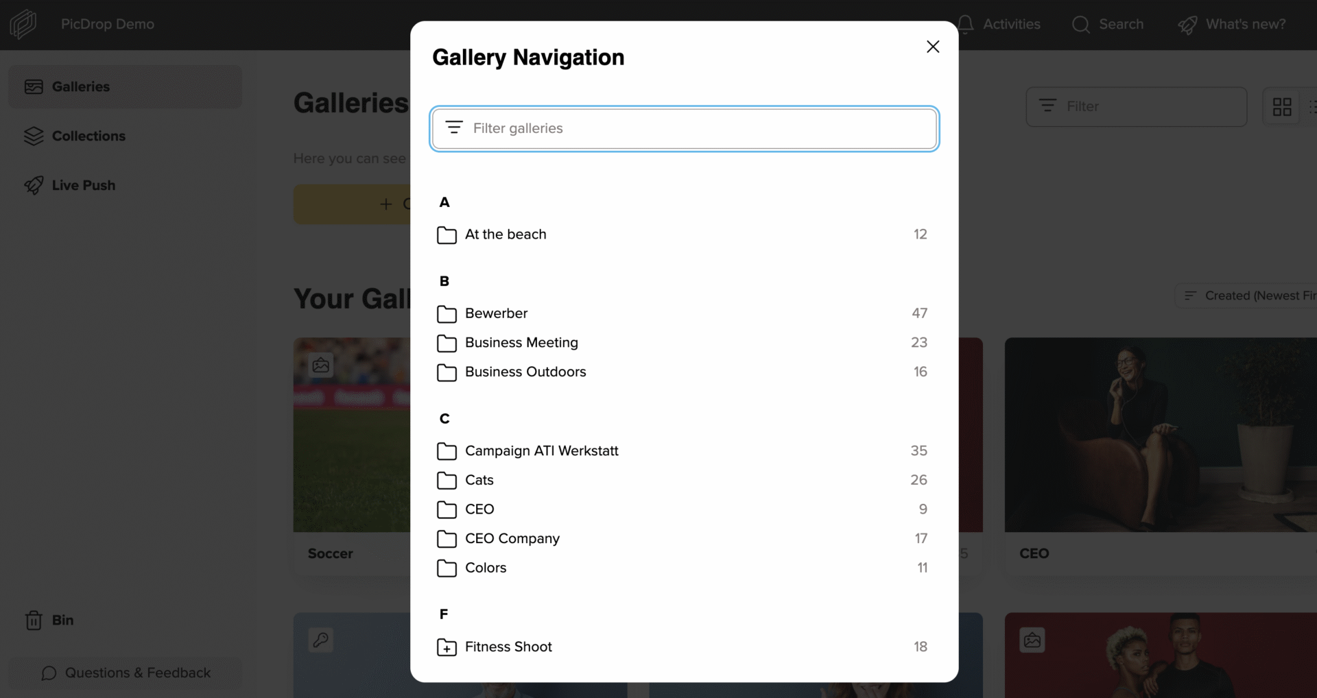 For clearer navigation, we recommend primarily using the filter bar on the left. There you can search for your galleries directly or make use of the existing alphabetical sorting.